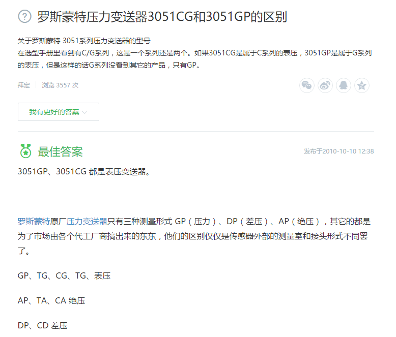 3051GP、3051CG 都是表壓變送器。 羅斯蒙特原廠壓力變送器只有三種測量形式 GP(壓力)、DP(差壓)、AP(絕壓),其它的都是為了市場由各個代工廠商搞出來的東東,他們的區(qū)別僅僅是傳感器外部的測量室和接頭形式不同罷了。GP、TG、CG、TG、表壓AP、TA、CA 絕壓DP、CD 差壓