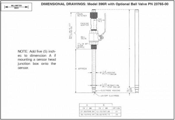 396R 傳感器本體是鈦材,帶獲得專利的聚丙烯參比電極液體接界、鈦接地極和球閥(后者要分別采購),適用于某些不能停產(chǎn)的流通式安裝需要。傳感器是鈦材套管的玻璃電極(pH) /鉑電極(ORP),測(cè)溫?zé)犭娮枋荘t100 或 3K Balco。 396R 傳感器不內(nèi)置前置放大器,配 15 英尺或者 9.5 英寸的電纜。如果分析儀或變送器內(nèi)沒有前置放大器,則即便傳感器的電纜為 15 英尺,也要另外采購內(nèi)置前置放大器的接線盒。此外,過程接頭和球閥附件也要另行采購。