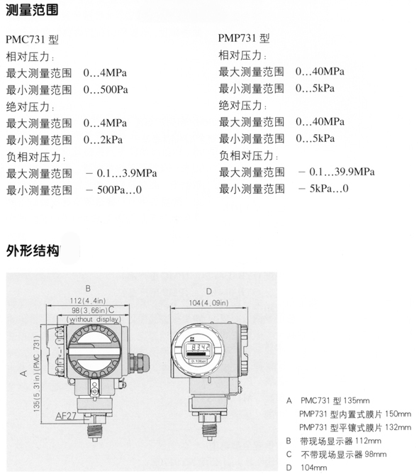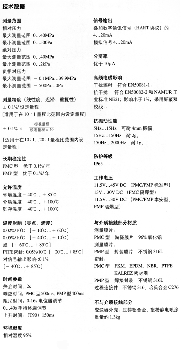 PMC/PMP731智能壓力變送器可精確測(cè)量所有化工及過程控制領(lǐng)域中氣體、蒸汽和液體的壓力,此傳感器可用于測(cè)量和液體的壓力,此傳感器可用于測(cè)量從5mbar至400mbar(0.075至6000psi)的表壓和絕壓。